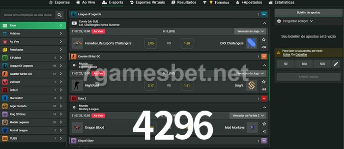 O 4296 oferece uma grande seleção de opções de apostas em e-sports com probabilidades competitivas